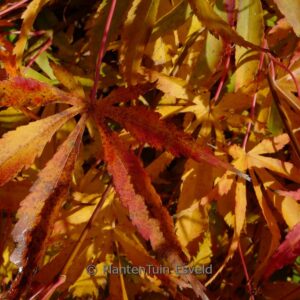 Nieuwe scheuten rose. Herfstkleur rood-oranje zoals niet ongebruikelijk is in deze Matsumurae Group. De bladeren zijn bijna tot aan de basis ingesneden, maar niet zo getand als bij deDissectums. Er zit in het voorjaar een bronskleurige gloed over de jonge bladeren. De hoogte na 10 jaar is 3 m. De bladkleur is donker groen. De bloeiperiode is april. Deze plant is goed winterhard. Aanbevolen aantal per vierkante meter : 1. Nederlandse naam : Japanse esdoorn . . Is aanwezig op de kwekerij. Kijk ook op de voorraadlijst op onze site.
