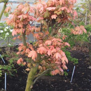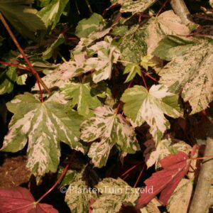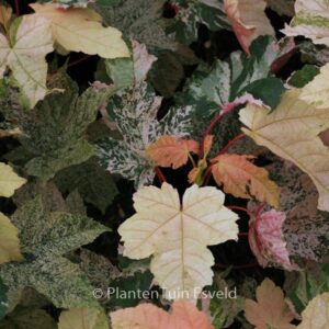bontbladige esdoorn voorjaarsblad rose/wit gespikkeld Vormt een bescheiden boompje, opvallender nog van voorjaarskleur dan de bekende Brilliantissimum. De hoogte na 10 jaar is 5 meter. De bladkleur is rose/wit. De bloeiperiode is april. Deze plant is goed winterhard. Aanbevolen aantal per vierkante meter : 1. Nederlandse naam : Gewone esdoorn . . Alleen op bestelling leverbaar. Levertijd minstens 1 week.