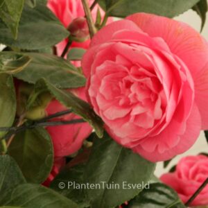 Ackermann hybride met dubbele bloemen Ongebruikelijk in de Ackerman selecties, een hybride van twee Camellia japonica cultivars. Toch ook weer een goed winterharde cultivar, ook geschikt voor wat koudere streken. De hoogte na 10 jaar is 200 cm. De bloemkleur is roserood. De bloeiperiode is maart. Deze plant is zeer winterhard. Nederlandse naam : Japanse roos . . Is aanwezig op de kwekerij. Kijk ook op de voorraadlijst op onze site.