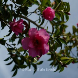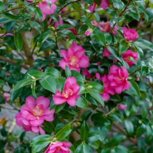 halfgevulde camellia met iets dubbele bloemkleur Deze Camellia wordt ook wel eens onder Camellia vernalis vermeld, maar wij zien er vooral een sasanqua in. De bloeitijd kan extreem lang zijn. Het record, gevestigd in de winter van 2018/19 staat op ruim vier en een halve maand!. De hoogte na 10 jaar is 200 cm. De bloemkleur is rood met lichter rood hart. De bloeiperiode is oktober – februari. Deze plant is goed winterhard. Aanbevolen aantal per vierkante meter : 1. Nederlandse naam : Camellia . . Is aanwezig op de kwekerij. Kijk ook op de voorraadlijst op onze site.