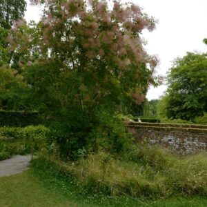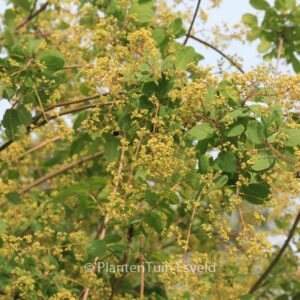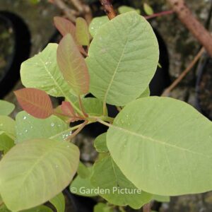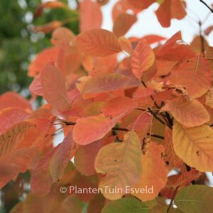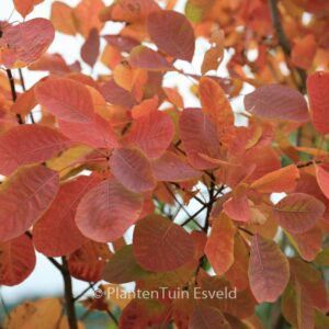 grootbladige pruikenboom met een prachtige herfstkleur!!! Dit is op termijn ook echt een boom, waar de veel bekendere Cotinus coggygria een struik blijft. Dit is dan ook de enige die de naam Pruikenboom verdient, de rest zijn Pruikenstruikjes. Amerikaanse soort met wat groter blad voorkomend in de Zuidelijke staten van de VS. De hoogte na 10 jaar is 4 m. De bloemkleur is groen verkleurend naar oranje. De bloeiperiode is mei – juni. Deze plant is zeer winterhard. Aanbevolen aantal per vierkante meter : 1. Nederlandse naam : Grootbladige pruikenboom Mogelijk alternatief : Cotinus coggygria. Belangrijkste verschil: Cotinus obovatus grotere bladeren. . Is aanwezig op de kwekerij. Kijk ook op de voorraadlijst op onze site.