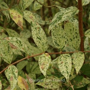 Middelgrote struik met sterk wit-bont blad. De hoogte na 10 jaar is 1,5 m. De bloemkleur is wit. De bloeiperiode is mei – juni. Deze plant is goed winterhard. Aanbevolen aantal per vierkante meter : 1. Nederlandse naam : Roze deutzia . . Alleen op bestelling leverbaar. Levertijd minstens 1 week.