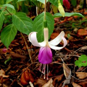 tuinfuchsia met bijzondere bloemkleur Het succesnummer van mijn eigen tuin. Wat een bloeirijke en mooi gekleurde tuinfuchsia is dit. Bij mij na enkele jaren anderhalve meterhoog geworden, maar misschien is het einde nog wel niet in zicht. De gemiddelde hoogte is 100 cm. De bloemkleur is lila/wit. De bloeiperiode is juni – oktober. Deze plant is goed winterhard. Aanbevolen aantal per vierkante meter : 3. Dit artikel is slechts in kleine hoeveelheden beschikbaar en kan plotseling niet meer leverbaar blijken. Nederlandse naam : Fuchsia . . Is aanwezig op de kwekerij. Kijk ook op de voorraadlijst op onze site.