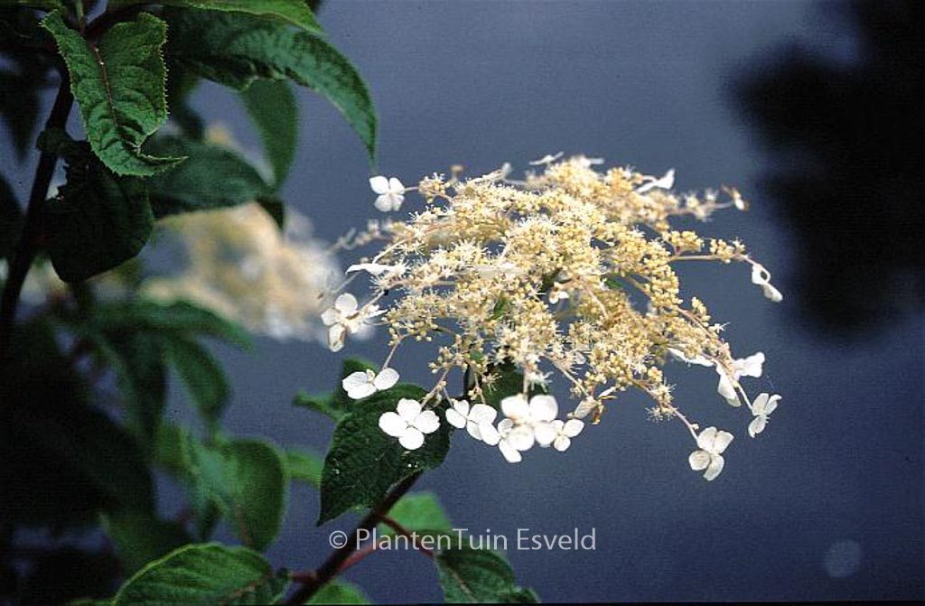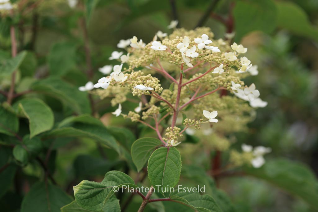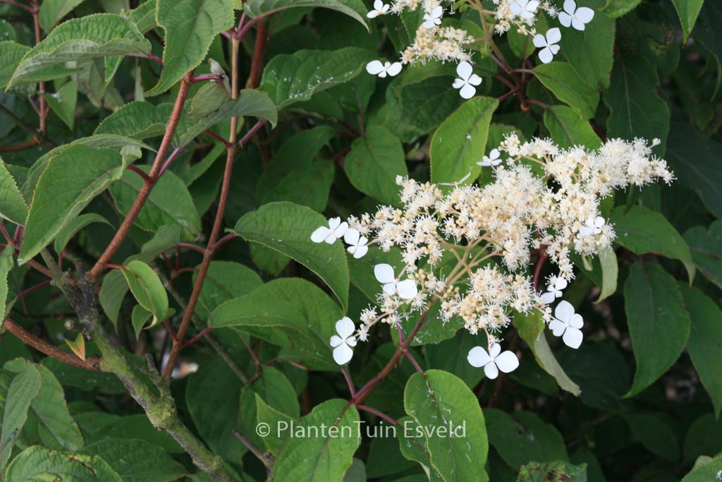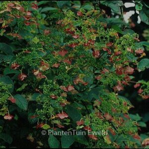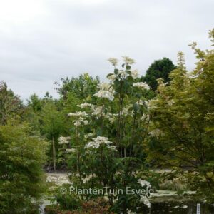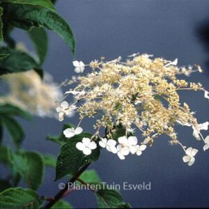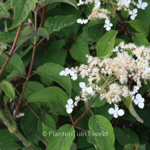 Selectie uit Arboretum Kalmthout, Belgie Deze flinke struik is door Jelena de Belder gekweekt uit zaden die in de natuur zijn verzameld. De selectie Kalmthout is een van de mooiste uit die zaailingen. De hoogte na 10 jaar is 250 cm. De bloemkleur is wit. juni – juli. Deze plant is goed winterhard. Aanbevolen aantal per vierkante meter : 2. Nederlandse naam : Hortensia . . Is aanwezig op de kwekerij. Kijk ook op de voorraadlijst op onze site.