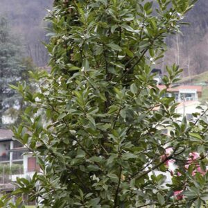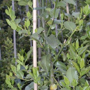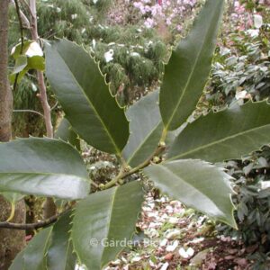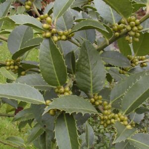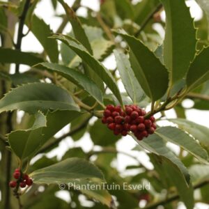 grootbladige hulst vormt een kleine boom. De hoogte na 10 jaar is 500 cm. De beskleur is oranjerood. De bloeiperiode is september – oktober. Deze plant is goed winterhard. Nederlandse naam : Hulst . Deze plant heeft de volgende onderscheiding: AGM, Award of Garden Merit, 1993. . Alleen op bestelling leverbaar. Levertijd minstens 1 week.