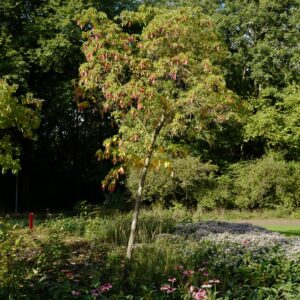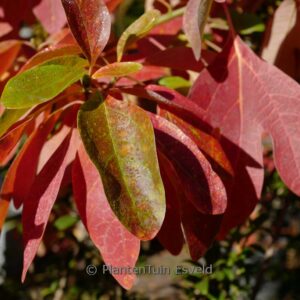zeldzaam boompje met een prachtige herfstkleur en heel grappig blad. Vaak met een bladlob links, of juist rechts, als een kinderwantje. Bijkomend voordeel, onder een Sassafras zitten geen muggen. Dus plant gewoon lekker een Sassafras bosje en je kunt mugvrij op je terras zitten. De hoogte na 10 jaar is 5 m. De bladkleur is groen. Deze plant is goed winterhard. Aanbevolen aantal per vierkante meter : 1. Nederlandse naam : Sassafras . De uitval bij Sassafras is soms zo groot, dat wij er geen enkele verantwoording voor kunnen dragen. De hergroei is vaak slecht en dode exemplaren worden niet door ons vergoed. . Alleen op bestelling leverbaar. Levertijd minstens 1 week.