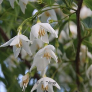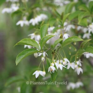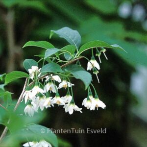 Chinese storax met leuke klokvormige bloemen Vormt een kleine boom en na de leuke bloei vormen zich kleine eivormige grijswitte vruchten. Ook leuk. De hoogte na 10 jaar is 250 cm. De bloemkleur is wit. De bloeiperiode is mei. Deze plant is goed winterhard. Nederlandse naam : Storaxboom . . Is aanwezig op de kwekerij. Kijk ook op de voorraadlijst op onze site.