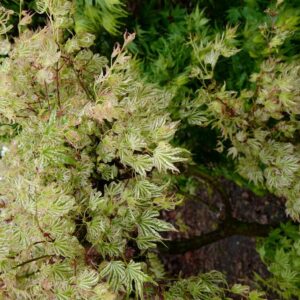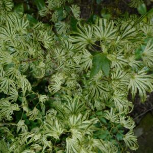 slanke struik met speciaal klauwachtig zalmgeel voorjaarsblad Betekenis van de Japanse naam: ‘berg parasol’. Pas sinds kort zijn er vergelijkbare cultivars zoals Festival of Alpenweiss, maar vroeger was hij enig in zijn soort. Let wel op, hij kan soms gewone groene bladeren maken, snoei die takjes rigoureus weg, anders winnen ze het. De hoogte na 10 jaar is 2 meter. De bladkleur is groen met witte nerven. De bloeiperiode is mei. Deze plant is zeer winterhard. Aanbevolen aantal per vierkante meter : 1. Nederlandse naam : Japanse esdoorn . . Alleen op bestelling leverbaar. Levertijd minstens 1 week.