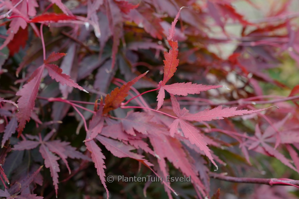 brede struik met vuurrode vruchten en mooie rode herfstkleur Betekenis van de Japanse naam:’ pijnboom in de wind’. De hoogte na 10 jaar is 2. 5 meter. De bladkleur is bronsbruin, later groen. De bloeiperiode is mei. Deze plant is zeer winterhard. Aanbevolen aantal per vierkante meter : 1. Nederlandse naam : Japanse esdoorn Mogelijk alternatief : Acer palmatum ‘Nicholsonii’. Belangrijkste verschil: Acer palmatum ‘Nicholsonii’ blad meer olijfkleurig. . Is aanwezig op de kwekerij. Kijk ook op de voorraadlijst op onze site.