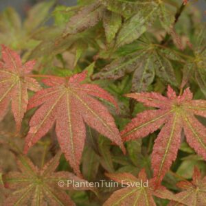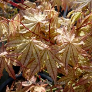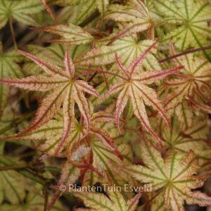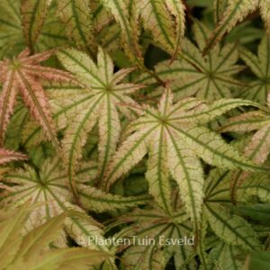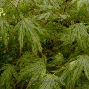 Australische selektie met opvallend geaderde bladeren Een duidelijke representant van de Reticulatum groep. De lichte bladnerven steken fraai af tegen de rest van het blad. Zeker niet de gemakkelijkste esdoorn ter wereld, maar wel een heel speciale. Lichte schaduw wordt op prijs gesteld. De hoogte na 10 jaar is 150cm. De bladkleur is groen met witrose aders. De bloeiperiode is mei. Deze plant is goed winterhard. Aanbevolen aantal per vierkante meter : 1. Nederlandse naam : Japanse esdoorn . . Alleen op bestelling leverbaar. Levertijd minstens 1 week.
