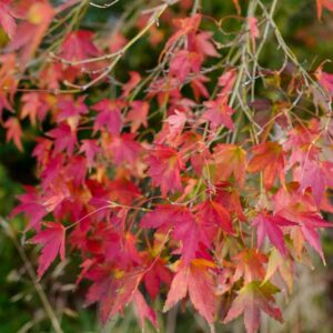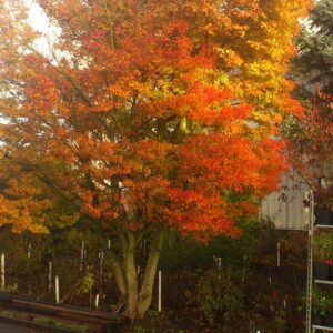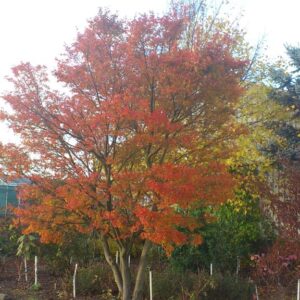 opgaande Japanse esdoorn met opvallende oranje herfstkleur Rising Sun is een eigen selectie van onze kwekerij. Eigenlijk is het een heel gewoon ogende Japanse esdoorn, met gewoon groen blad en weinig onderscheidende kenmerken. Maar de herfstkleur is top. De moederplant bij ons parkeerterrein steelt iedere herfst de show. De hoogte na 10 jaar is 3 meter. De bladkleur is groen. De bloeiperiode is mei. Deze plant is zeer winterhard. Aanbevolen aantal per vierkante meter : 1. Nederlandse naam : Japanse esdoorn Mogelijke alternatieven : Acer palmatum. Belangrijkste verschil: Acer palmatum ‘Rising Sun’ betrouwbaar oranje herfstkleur. Acer palmatum ‘Ichigyo-Ji’. Belangrijkste verschil: Acer palmatum ‘Rising Sun’ iets kleiner blad. Deze plant heeft de volgende onderscheiding: Deze soort is in 1999 door ons geintroduceerd als nieuwigheid. . Alleen op bestelling leverbaar. Levertijd minstens 1 week.