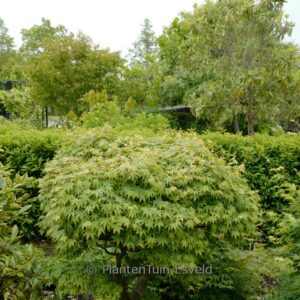 Fijnbladige Jap. esdoorn geselekteerd voor bonsaicultuur omdat de vertakking goed is en de afstand tussen de bladparen relatief klein. Dat maakt het voor de bon-sai meester een stukje gemakkelijker en dat is natuurlijk fijn. Het is een introductie van Dick van der Maat, een Boskoopse kweker die veel esdoorns heeft geselecteerd. De hoogte na 10 jaar is 250 cm. De bladkleur is groen. De bloeiperiode is mei. Deze plant is goed winterhard. Aanbevolen aantal per vierkante meter : 1. Nederlandse naam : Japanse esdoorn . . Is aanwezig op de kwekerij. Kijk ook op de voorraadlijst op onze site.