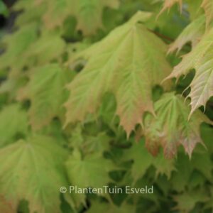 bolesdoorn, vormt zonder snoei een bol Vaak zie je deze Noorse bol-esdoorn op een stam geent. Maar je kunt er natuurlijk ook een struikje van kweken. Dan is het fris geelgroene blad een lichtpuntje in de border. De hoogte na 10 jaar is 5 m. De bladkleur is geel. De bloeiperiode is april – mei. Deze plant is goed winterhard. Aanbevolen aantal per vierkante meter : 1. Nederlandse naam : Noorse esdoorn . . Alleen op bestelling leverbaar. Levertijd minstens 1 week.