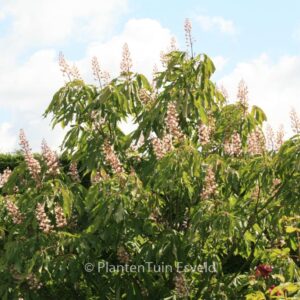 Indische kastanje met opmerkelijke bloemkleur maar ook fraai zilverigblad in het voorjaar bij het uitlopen. Dan is het misschien wel de mooiste kastanje van allemaal. De hoogte na 10 jaar is 6 meter. De bloemkleur is rose. De bloeiperiode is mei. Deze plant is goed winterhard. Aanbevolen aantal per vierkante meter : 1. Nederlandse naam : Indische paardenkastanje . . Is aanwezig op de kwekerij. Kijk ook op de voorraadlijst op onze site. .