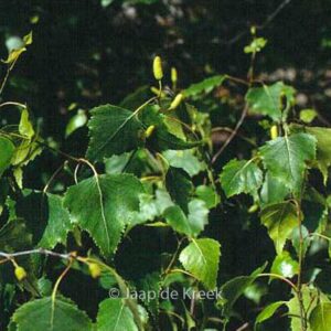 populierbladige berk; pionierboom, dus vrij kortlevend. De hoogte na 10 jaar is 5 m. De bloemkleur is geel. De bloeiperiode is maart – april. Deze plant is zeer winterhard. Aanbevolen aantal per vierkante meter : 1. Nederlandse naam : Populierbladige berk . De uitval bij Betula is soms zo groot, dat wij er geen enkele verantwoording voor kunnen dragen. Dode exemplaren worden niet door ons vergoed. . Alleen op bestelling leverbaar. Levertijd minstens 1 week.