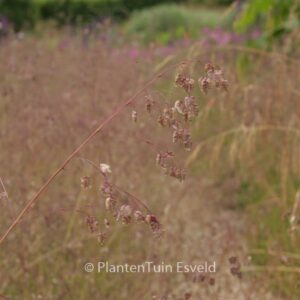 trilgras of bevertjesgras vanwege de platte bloeiaartjes Briza houdt van een zonnige standplaats, maar niet van heel droge grond. De gemiddelde hoogte is 75 cm. De bloemkleur is wit. De bloeiperiode is juni – augustus. Deze plant is goed winterhard. Aanbevolen aantal per vierkante meter : 7. Nederlandse naam : Bevertjes . . Alleen op bestelling leverbaar. Levertijd minstens 1 week.