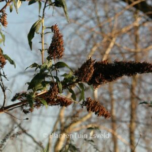 de oervorm van alle soorten. De hoogte na 10 jaar is 100 cm. De bloemkleur is lilapaars. De bloeiperiode is juli – september. Deze plant is goed winterhard. Aanbevolen aantal per vierkante meter : 1. Nederlandse naam : Vlinderstruik . . Alleen op bestelling leverbaar. Levertijd minstens 1 week.