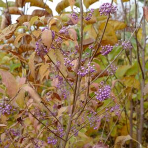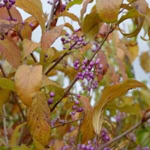 Selectie met koperkleurige herfstkleur; paarse bessen Een selectie van plantenvriend Peter Vanlaerhoven die op zijn kwekerij veel planten uit zaad kweekt en een scherp oog heeft voor bijzondere zaailingen die net iets beter zijn dan gemiddeld. Bovendien geeft hijze grappige cultivarnamen. De hoogte na 10 jaar is 2,5 m. De bloemkleur is onopvallend licht-roze. De bloeiperiode is juli. Deze plant is goed winterhard. Aanbevolen aantal per vierkante meter : 1. Nederlandse naam : Japanse schoonvrucht . . Is aanwezig op de kwekerij. Kijk ook op de voorraadlijst op onze site. .