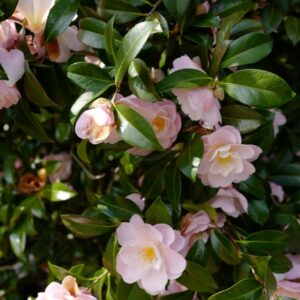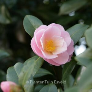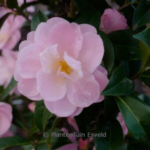 dubbelbloemige camellia met frisse bloemkleur Nieuw Zeelandse cultivar uit 1958, uitgevoerd in zachtroze. En in die kleur zijn er eigenlijk niet zoveel. Dit is wel een erg fraaie, ook al zullen sommige nette tuiniers de plant wat aan de rommelige kant vinden. Ik noem dat overigens liever elegant. De hoogte na 10 jaar is 1. 5 meter. De bloemkleur is rose. de bloeiperiode is maart – april. Deze plant is goed winterhard. Nederlandse naam : Camellia . . Is aanwezig op de kwekerij. Kijk ook op de voorraadlijst op onze site.