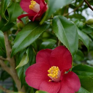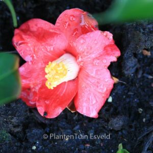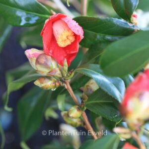 enkelbloemige Japanse tuin camellia met geel hart Wat een geweldig leuk struikje, deze Adeyaka. Een zeer bescheiden groeiende struik die dus ook in de wat kleinere tuin voldoet. De enkele bloemen vertederen zelfs de tuiniers die niet van de wat uitbundiger Camellia’s houden. De hoogte na 10 jaar is 200 cm. De bloemkleur is rood. De bloeiperiode is maart. Deze plant is goed winterhard. Aanbevolen aantal per vierkante meter : 1. Nederlandse naam : Japanse roos . . Is aanwezig op de kwekerij. Kijk ook op de voorraadlijst op onze site.
