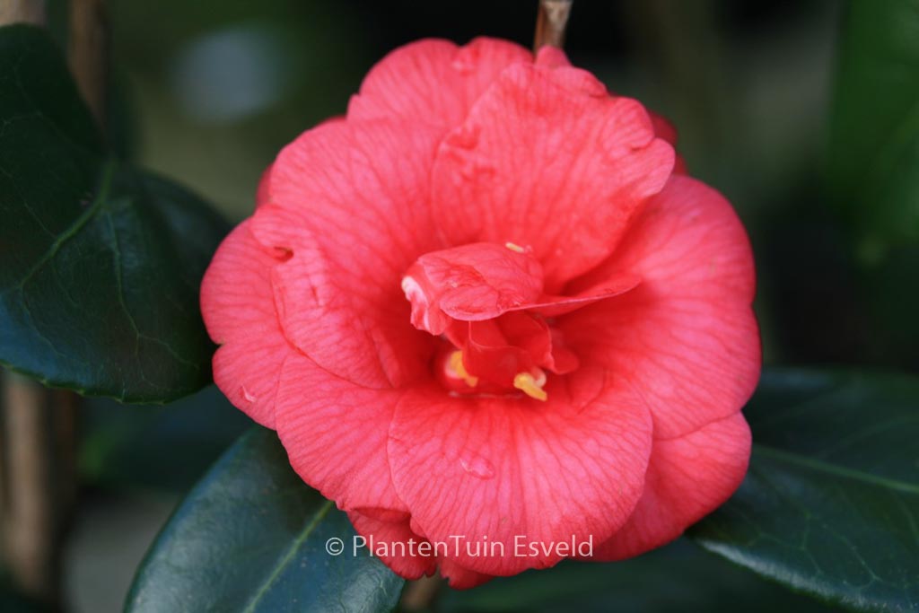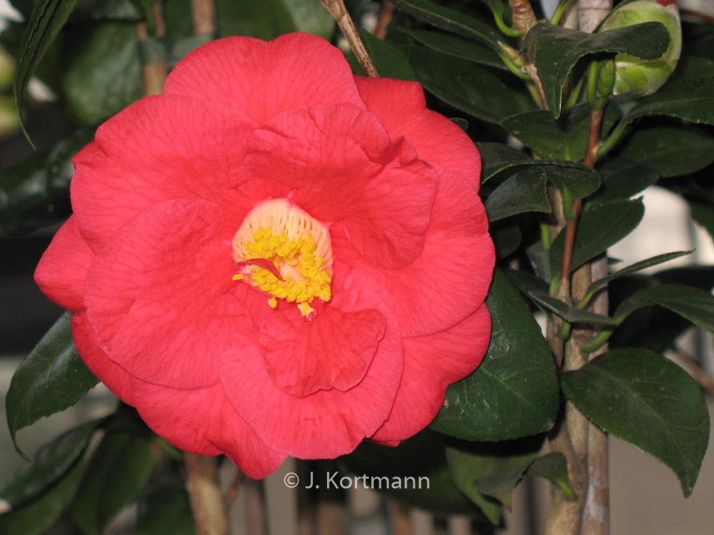 Halfgevulde rode bloemen met soms wat onregelmatige witte vlekken; gele meeldraden. De hoogte na 10 jaar is 2 m. De bloemkleur is rood en wit. De bloeiperiode is maart – april. Deze plant is matig winterhard. Aanbevolen aantal per vierkante meter : 1. Nederlandse naam : Japanse roos . . Is aanwezig op de kwekerij. Kijk ook op de voorraadlijst op onze site.