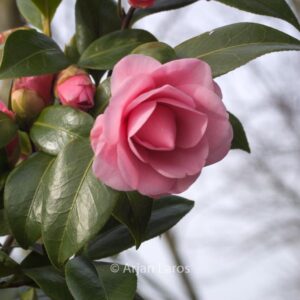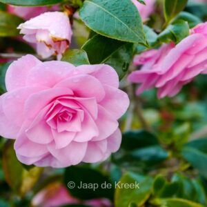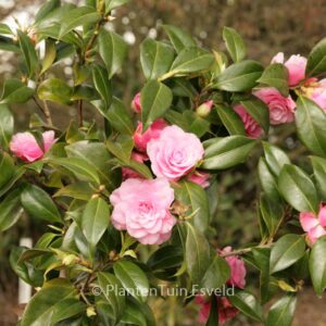 dubbelbloemige tuin- camellia met frisse bloemkleur Tamelijk los en open groeiende flinke struik met bloemen van ruim tien centimeter doorsnede. Bloeitijd vroeg tot midden. De hoogte na 10 jaar is 200 cm. De bloemkleur is rose. De bloeiperiode is maart – april. Deze plant is goed winterhard. Nederlandse naam : Japanse roos . . Is aanwezig op de kwekerij. Kijk ook op de voorraadlijst op onze site.