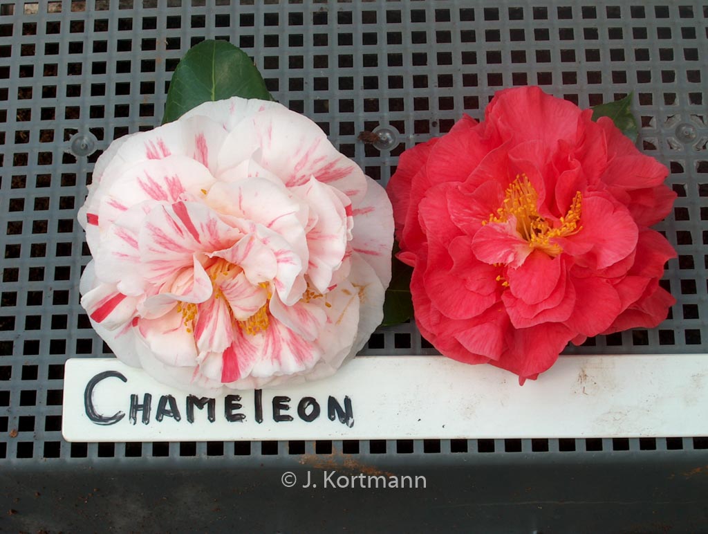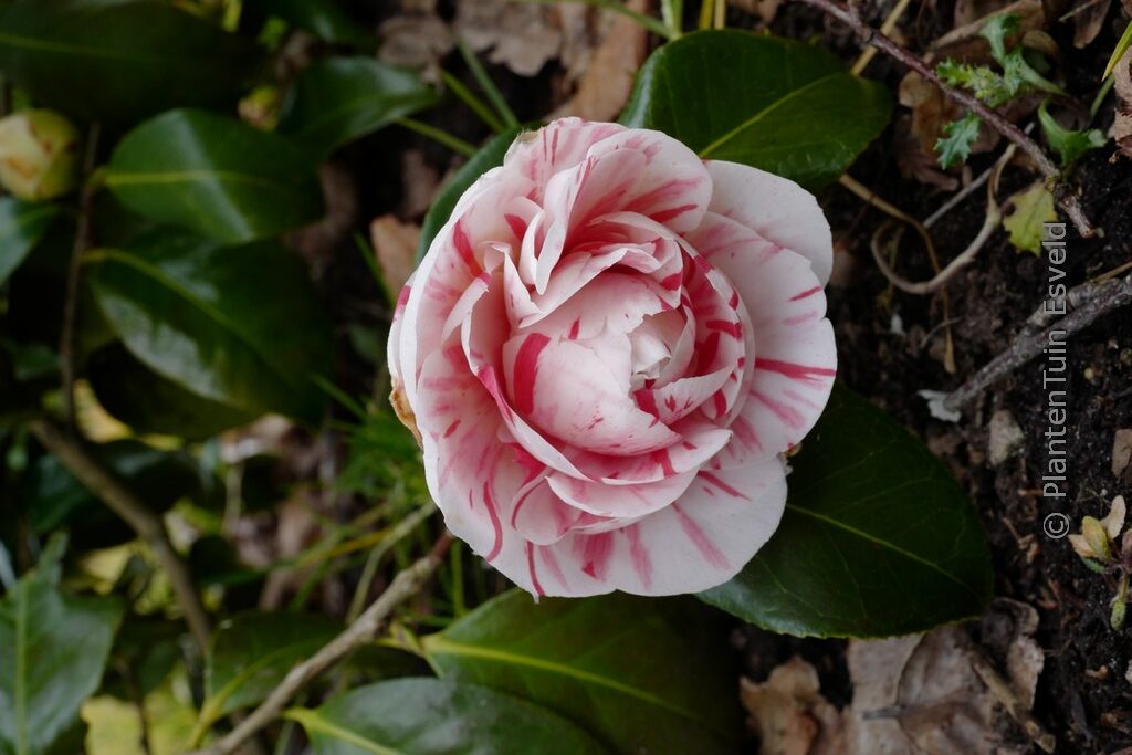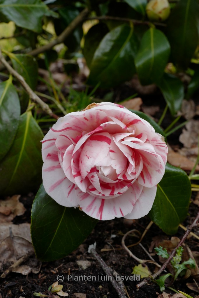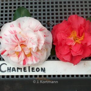 halfgevulde pioenvormige camellia meerkleurige bloemen Een cultivar met zeer gevarieerde bloemkleur, van wit of heel lichtroze tot rood, maar vaak ook iets daartussenin als een mengeling van alle kleuren in banen, strepen of vlekken. Bloeitijd laat. De hoogte na 10 jaar is 200 cm. De bloemkleur is roserood en wit. De bloeiperiode is maart – april. Deze plant is goed winterhard. Nederlandse naam : Japanse roos . . Is aanwezig op de kwekerij. Kijk ook op de voorraadlijst op onze site.