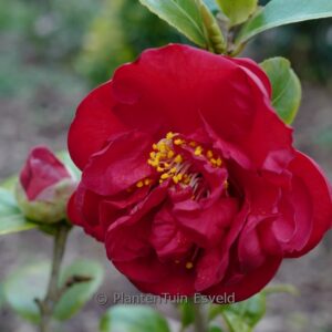 Halfgevulde bloemen met een diepe kleur; gele meeldraden. De hoogte na 10 jaar is 2,5 m. De bloemkleur is scharlakenrood. De bloeiperiode is februari – april. Deze plant is goed winterhard. Aanbevolen aantal per vierkante meter : 1. Nederlandse naam : Japanse roos . . Is aanwezig op de kwekerij. Kijk ook op de voorraadlijst op onze site.