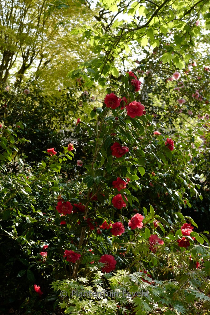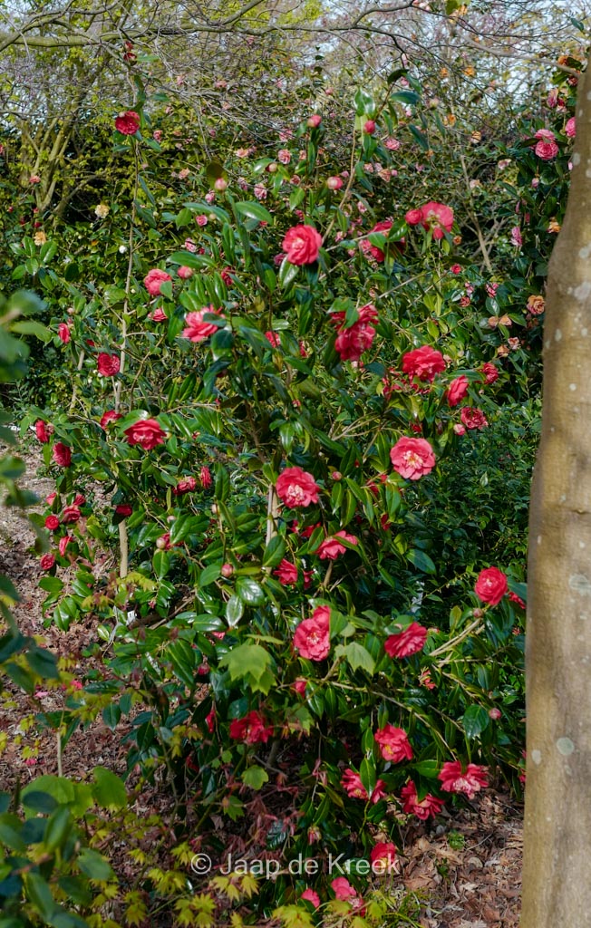 Ackermann hybride, dubbel- bloemig, opgaande dichte groeivorm Zeer winterharde hybride van japonica en oleifera. Bloeitijd midden tot laat. De hoogte na 10 jaar is 200 cm. De bloemkleur is donker roserood. De bloeiperiode is maart – april. Deze plant is zeer winterhard. Aanbevolen aantal per vierkante meter : 2. Nederlandse naam : Japanse roos . . Is aanwezig op de kwekerij. Kijk ook op de voorraadlijst op onze site.