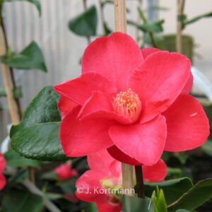 enkelbloemige camellia bloemrand gezaagd, compact opgaand Deze in 1913 geintroduceerde cultivar is niet helemaal stabiel in zijn eigenschappen. De bloemvorm is wat veranderlijk. Bloeitijd middentot laat. De hoogte na 10 jaar is 100 cm. De bloemkleur is rood. De bloeiperiode is maart – april. Deze plant is goed winterhard. Aanbevolen aantal per vierkante meter : 1. Nederlandse naam : Japanse roos . . Is aanwezig op de kwekerij. Kijk ook op de voorraadlijst op onze site.