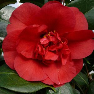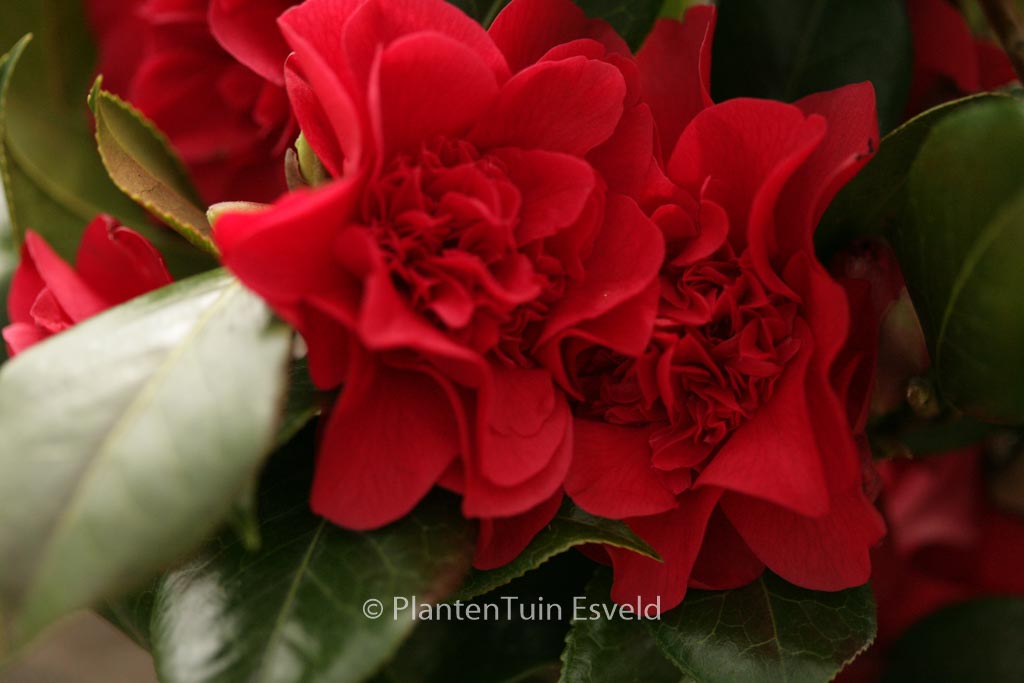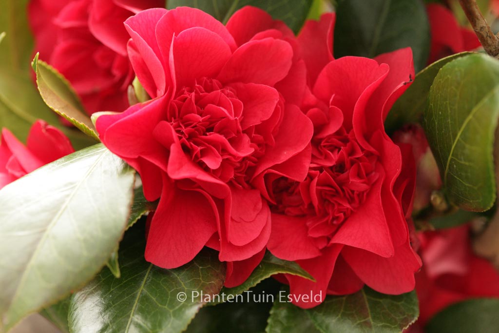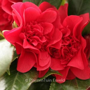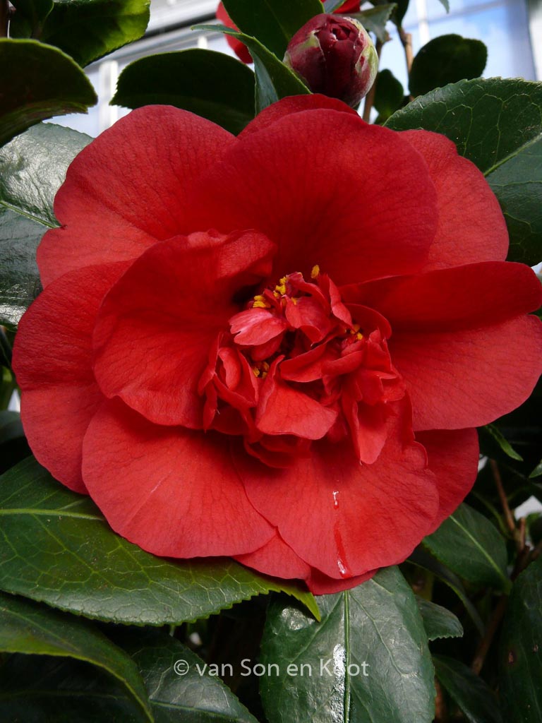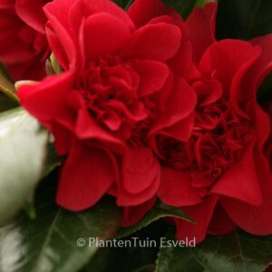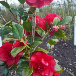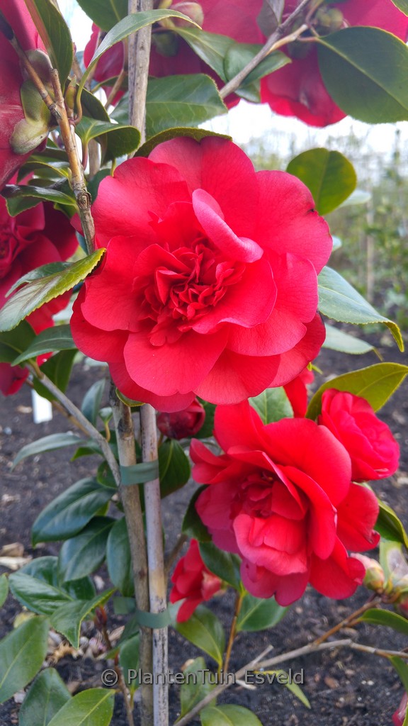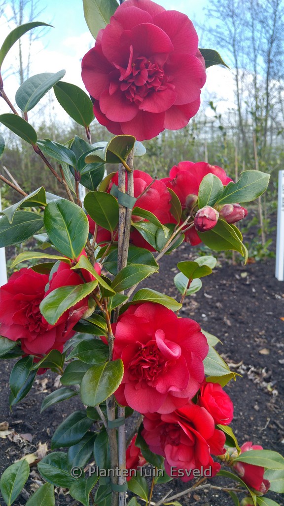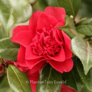 dubbelbloemige camellia met wijnrode jonge scheuten Maar de mooie jonge scheuten zijn natuurlijk niet de enige kwaliteit van deze Engelse cultivar uit 2004. De kroonbladen, gegroepeerd rond een hart van petaloiden, zijn helderrood. Bloeitijd midden tot laat. De hoogte na 10 jaar is 200 cm. De bloemkleur is helderrood. De bloeiperiode is februari – maart. Deze plant is goed winterhard. Nederlandse naam : Japanse roos . . Is aanwezig op de kwekerij. Kijk ook op de voorraadlijst op onze site.