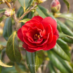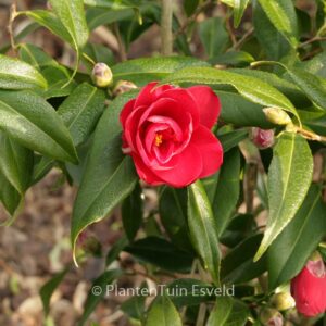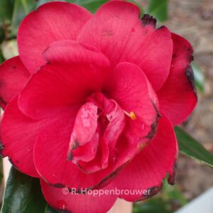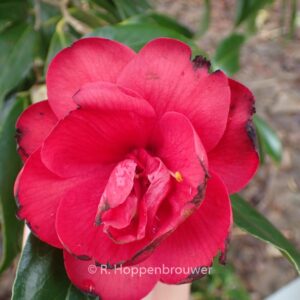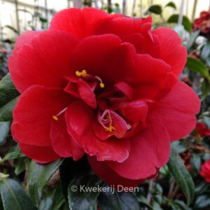 dubbelbloemige Camellia met donkere bloemkleur Wederom een Camellia uit de stal van de Amerikaanse veredelaar Ackerman. Donkerrode half gevulde bloemen. Zoals bij alle Ackerman hybriden, goed winterhard. Bloeitijd midden. De hoogte na 10 jaar is 250 cm. De bloemkleur is rood. De bloeiperiode is februari – maart. Deze plant is goed winterhard. Nederlandse naam : Japanse roos . . Is aanwezig op de kwekerij. Kijk ook op de voorraadlijst op onze site.
