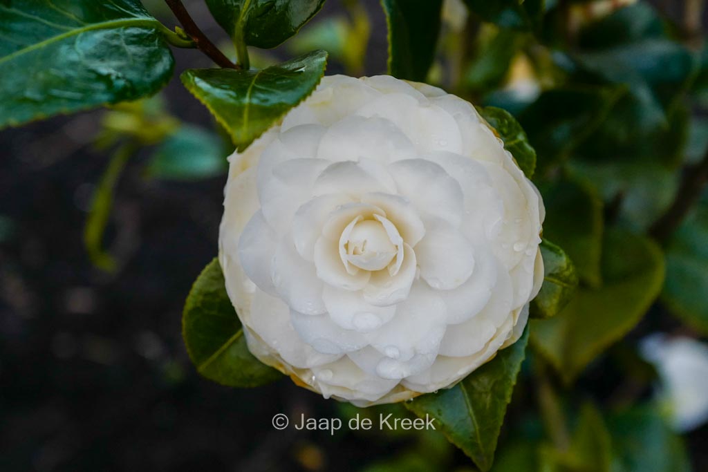 winterharde camellia met roosvormige bloemen Ontstaan in Italie inn 1858 en nog steeds in cultuur. Fijne rozerode adertjes in de witte bloembladen geven een delicaat effect. De hoogte na 10 jaar is 200 cm. De bloemkleur is wit en rood. De bloeiperiode is april. Deze plant is goed winterhard. Aanbevolen aantal per vierkante meter : 1. Nederlandse naam : Japanse roos . Deze plant heeft de volgende onderscheiding: AGM, Award of Garden Merit, 1993. . Is aanwezig op de kwekerij. Kijk ook op de voorraadlijst op onze site.