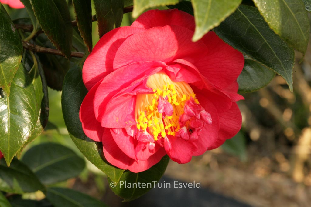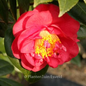 gevuldbloemige camellia met heldere bloemkleur Wederom een Ackerman hybride met Camellia oleifera voor de winter hardheid. De halfgevulde licht rode bloemen zijn middelgroot. De hoogte na 10 jaar is 200 cm. De bloemkleur is rood. De bloeiperiode is februari – maart. Deze plant is goed winterhard. Nederlandse naam : Japanse roos . . Is aanwezig op de kwekerij. Kijk ook op de voorraadlijst op onze site.