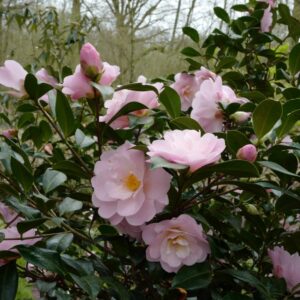Recente, rijk bloeiende introductie met halfgevulde bloemen met gele meeldragen. Groeit langzaam en opgaand-compact. De hoogte na 10 jaar is 1,25 m. De bloemkleur is zachtroze. De bloeiperiode is februari – april. Deze plant is goed winterhard. Aanbevolen aantal per vierkante meter : 1. Nederlandse naam : Camellia . . Is aanwezig op de kwekerij. Kijk ook op de voorraadlijst op onze site.