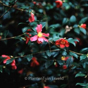 Herfstbloeiende Camellia met talrijke, ongevulde bloemen De eerste Camellia sasanqua waarvan wij ons bewust werden. Voor die tijd waren deze herfstbloeiende Camellia’s ons nooit zo opgevallen. Maar als je het eenmaal gezien hebt, kun je het nooit meer niet zien. Losse en sierlijke struik met een maandenlange bloeitijd. De hoogte na 10 jaar is 2 meter. De bloemkleur is rood met gele meeldraden. De bloeiperiode is oktober – januari. Deze plant is goed winterhard. Nederlandse naam : Camellia . Deze plant heeft de volgende onderscheiding: AGM, Award of Garden Merit, 1993. . Is aanwezig op de kwekerij. Kijk ook op de voorraadlijst op onze site.