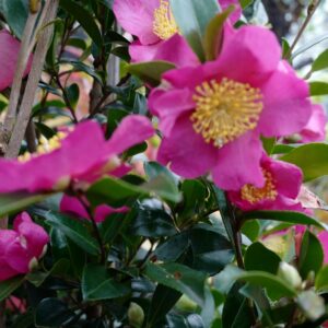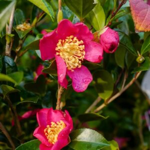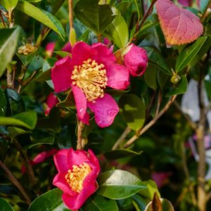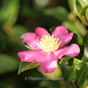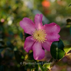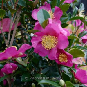 enkelbloemige camellia met licht geurende bloemen Echt helderrood zijn de bloemen van deze herfstbloeiende Camellia niet maar het komt aardig dicht in de buurt. Ook weer een elegante struik met de bekende sasanqua kwaliteiten. Geur en een slimme bloeitijd. Deze ontwikkelt zich langzaam maar zeker tot een favoriet van Esveld. De hoogte na 10 jaar is 200 cm. De bloemkleur is roserood. De bloeiperiode is december – januari. Deze plant is goed winterhard. Aanbevolen aantal per vierkante meter : 1. Nederlandse naam : Camellia . . Is aanwezig op de kwekerij. Kijk ook op de voorraadlijst op onze site.
