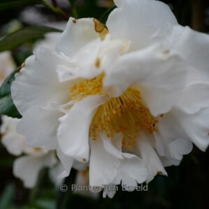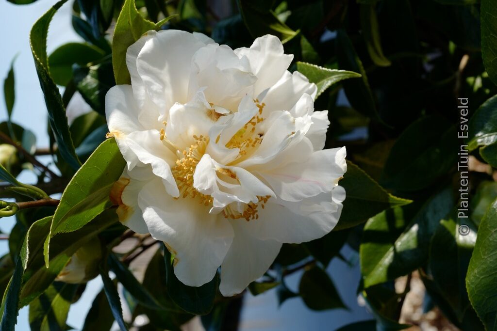 Zeer grote, halfgevulde, geurende witte bloemen die soms wat onregelmatige roze vlekken of strepen kunnen hebben. Prominente gele meeldraden. Krachtige, opgaande groei. De hoogte na 10 jaar is 1,5 m. De bloemkleur is wit (soms met roze vlekken). De bloeiperiode is februari – april. Deze plant is goed winterhard. Aanbevolen aantal per vierkante meter : 1. Nederlandse naam : Camellia . . Is aanwezig op de kwekerij. Kijk ook op de voorraadlijst op onze site.