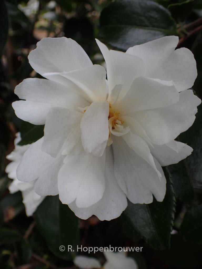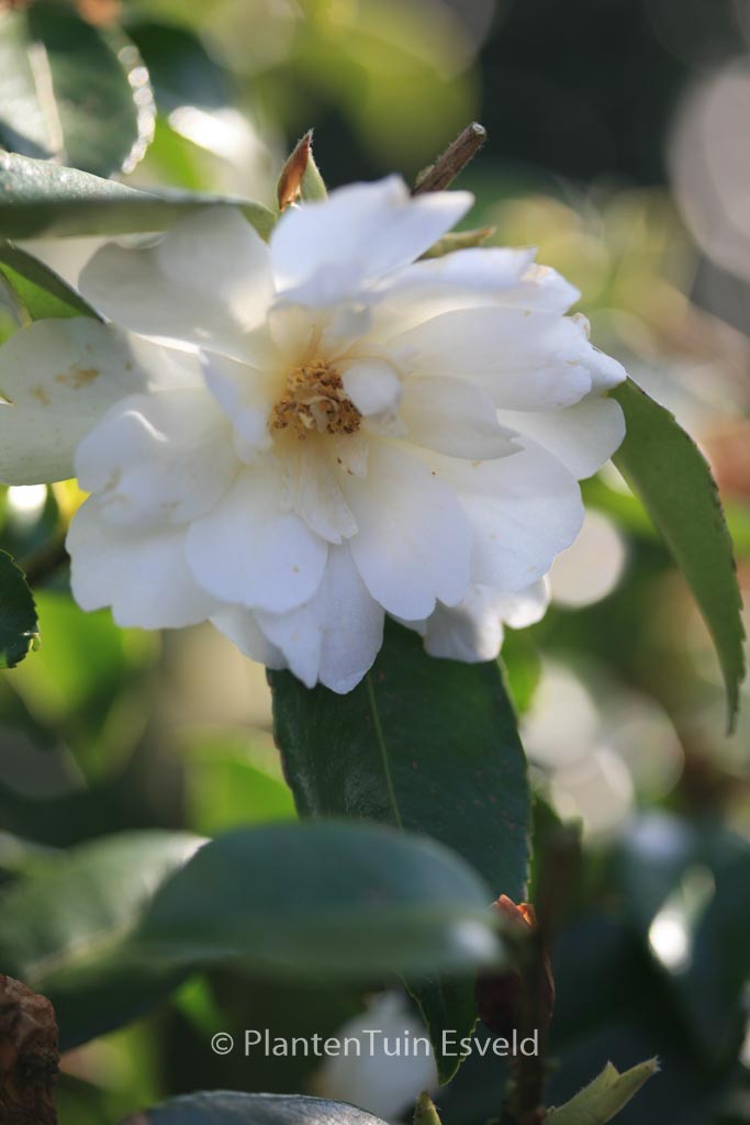 dubbelbloemige Camellia Ackermann hybride De vroege bloeitijd van deze gevuldbloemige witte Camellia gepaard aan de goede winterhardheid die de Ackerman hybriden eigen is maakt deze cultivar een goede plant voor de late herfsttuin. De hoogte na 10 jaar is 250 cm. De bloemkleur is wit. De bloeiperiode is november – december. Deze plant is goed winterhard. Nederlandse naam : Camellia . . Is aanwezig op de kwekerij. Kijk ook op de voorraadlijst op onze site.