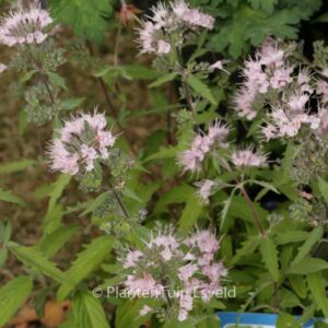 Nieuwe selectie met rose bloemen; goed gedraineerd planten. De hoogte na 10 jaar is 1,25 m. De bloemkleur is lichtrose. De bloeiperiode is augustus – oktober. Deze plant is goed winterhard. Aanbevolen aantal per vierkante meter : 2. Nederlandse naam : Baardbloem . . Alleen op bestelling leverbaar. Levertijd minstens 1 week.