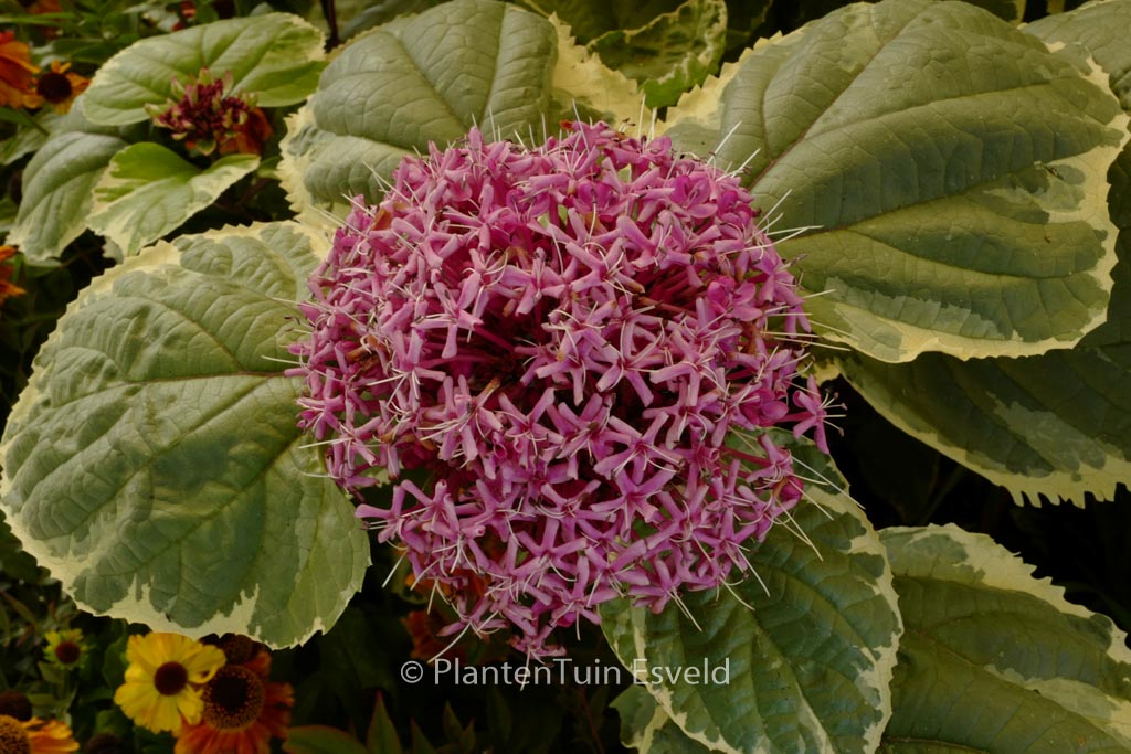 nazomer bloeiende struik met groen-wit bont blad Een zeer exotisch ogende halfheester. In strenge winters kan deze struik bijna tot de grond wegvriezen om daarna ongestoord weer terug te komen na de winter. In milde winters sterft de Clerodendrum bungei natuurlijk veel minder in. De hoogte na 10 jaar is 150cm. De bloemkleur is rose-rood. De bloeiperiode is juli – september. Deze plant is matig winterhard. Aanbevolen aantal per vierkante meter : 1. Nederlandse naam : Kansenboom . Deze plant heeft de volgende onderscheiding: Gouden Medaille Vakbeurs Plantarium 2001. . Is aanwezig op de kwekerij. Kijk ook op de voorraadlijst op onze site.