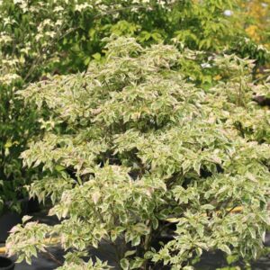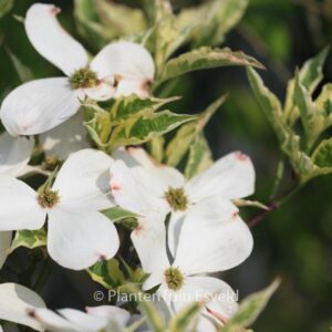 grootbloemige Amerikaanse kornoelje met bont blad. De hoogte na 10 jaar is 250 cm. De bloemkleur is wit. De bloeiperiode is mei. Deze plant is goed winterhard. Aanbevolen aantal per vierkante meter : 1. Nederlandse naam : Veelbloemige kornoelje . Deze plant heeft de volgende onderscheiding: AGM, Award of Garden Merit, 2012. . Alleen op bestelling leverbaar. Levertijd minstens 1 week.