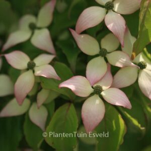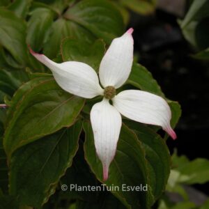 lage en spreidende groei. De hoogte na 10 jaar is 125 cm. De bloemkleur is licht rose. De bloeiperiode is mei – juni. Deze plant is goed winterhard. Aanbevolen aantal per vierkante meter : 1. Nederlandse naam : Japanse grootbloemige kornoelje . . Alleen op bestelling leverbaar. Levertijd minstens 1 week.