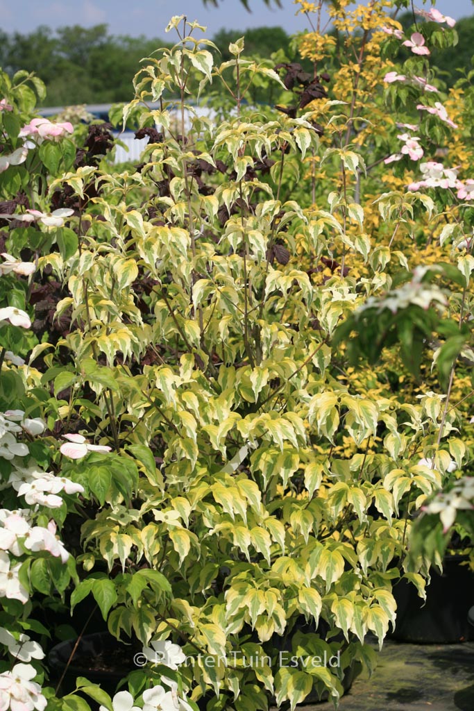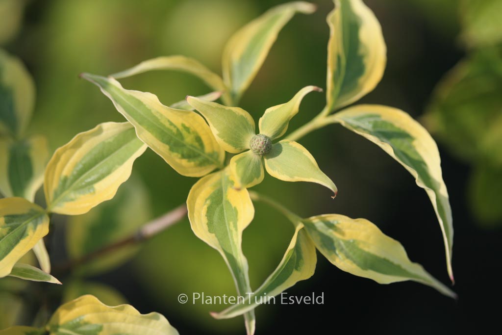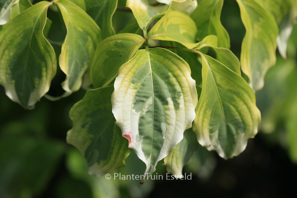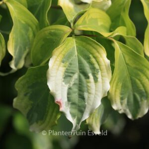 Blad fijn cremegeel-bont; opgaande groeiwijze; herfstkleur!. De hoogte na 10 jaar is 2,5 m. De bloemkleur is wit. De bloeiperiode is mei – juni. Deze plant is goed winterhard. Nederlandse naam : Japanse grootbloemige kornoelje . . Alleen op bestelling leverbaar. Levertijd minstens 1 week.