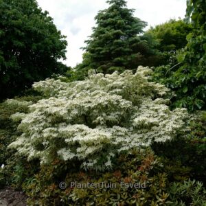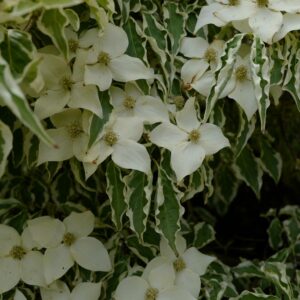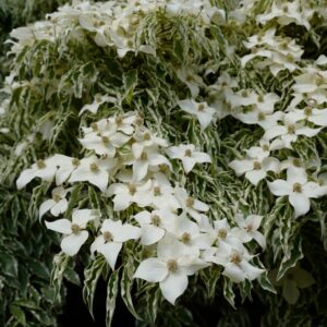 een van de beste bont bladige! grijsgroen met witte rand. De hoogte na 10 jaar is 2 meter. De bloemkleur is wit. De bloeiperiode is mei – juni. Deze plant is goed winterhard. Aanbevolen aantal per vierkante meter : 1. Nederlandse naam : Japanse grootbloemige kornoelje . Deze plant heeft de volgende onderscheiding: AGM, Award of Garden Merit, 2012. . Alleen op bestelling leverbaar. Levertijd minstens 1 week.
