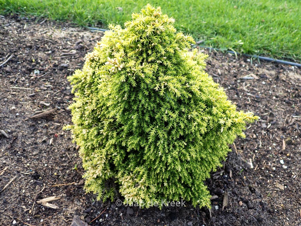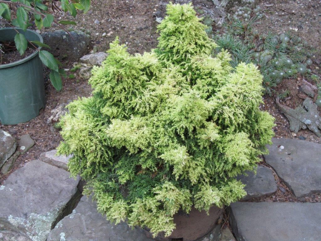 Opgaande, conische dwerg- vorm met gele, jonge naalden Ontstaan in de Verenigde Staten als een geelnaaldige sport van Tansu maar nu verspreidt onder de correcte naam Twinkle Toes. Het is een traag groeiende selectie geschikt voor de kleine tuin. De hoogte na 10 jaar is 30 cm. Deze plant is zeer winterhard. Aanbevolen aantal per vierkante meter : 7. Nederlandse naam : Sikkelcipres . . Alleen op bestelling leverbaar. Levertijd minstens 1 week.