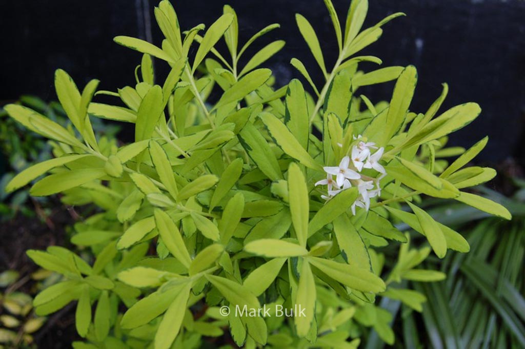 Blad groengeel met een groene rand; goed geurend. De hoogte na 10 jaar is 1 meter. De bloemkleur is wit. De bloeiperiode is mei. Deze plant is goed winterhard. Alle Daphne soorten zijn moeilijk te verplanten. Wij kunnen dan ook geen hergroeigarantie geven. Alle Daphne houden van zware grond. . . Alleen op bestelling leverbaar. Levertijd minstens 1 week.