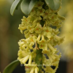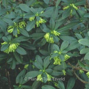schaduwminnend bladhoudend struikje, zwarte bessen. De hoogte na 10 jaar is 100 cm. De bloemkleur is geel-groen. De bloeiperiode is februari – maart. Deze plant is zeer winterhard. Aanbevolen aantal per vierkante meter : 1. Nederlandse naam : Zwart peperboompje Alle Daphne soorten zijn moeilijk te verplanten. Wij kunnen dan ook geen hergroeigarantie geven. Alle Daphne houden van zware grond. . . Alleen op bestelling leverbaar. Levertijd minstens 1 week.
