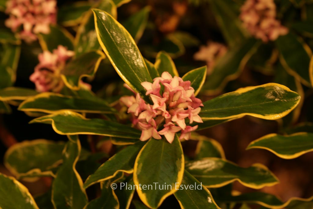 donkerrose knoppen openen naar wit, roomwitte bladrand, geur! Deze wintergroene struik verlangt een kalkrijke grond, klei is dus geen enkel probleem, sterker nog, een aanrader. De bloemengeur van de Daphne odora is sterk, hij heet niet voor niets odora. De hoogte na 10 jaar is 100 cm. De bloemkleur is licht rose, donker rose knop. De bloeiperiode is maart – april. Deze plant is matig winterhard. Aanbevolen aantal per vierkante meter : 1. Alle Daphne soorten zijn moeilijk te verplanten. Wij kunnen dan ook geen hergroeigarantie geven. Alle Daphne houden van zware grond. . . Is aanwezig op de kwekerij. Kijk ook op de voorraadlijst op onze site.