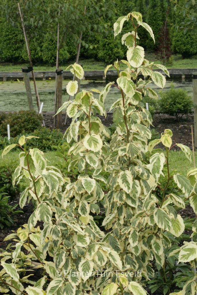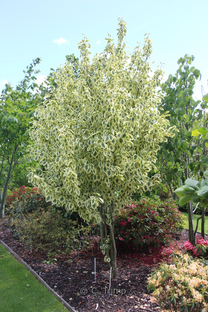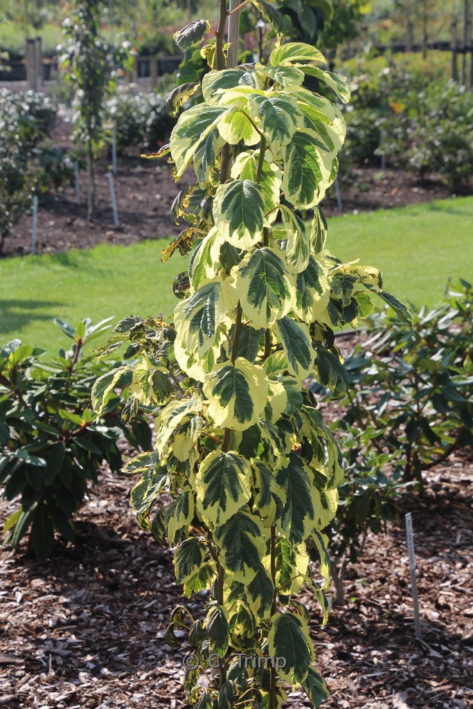 Zeer decorative cremewitte bladrand; voor plek in halfschaduw waar deze vaantjes boom dan uit kan groeien tot een bescheiden boompje. De bloemen zijn bescheiden van formaat, maar de grote schut bladen maken de bloeiwijze toch heel decoratief. De Engelse naam is farewell tree en in bij ons wordt ook zakdoekjesboom gebruikt. De hoogte na 10 jaar is 4 meter. De bloemkleur is wit. De bloeiperiode is mei – juni. Deze plant is zeer winterhard. Nederlandse naam : Zakdoekjesboom . . Is aanwezig op de kwekerij. Kijk ook op de voorraadlijst op onze site. .
